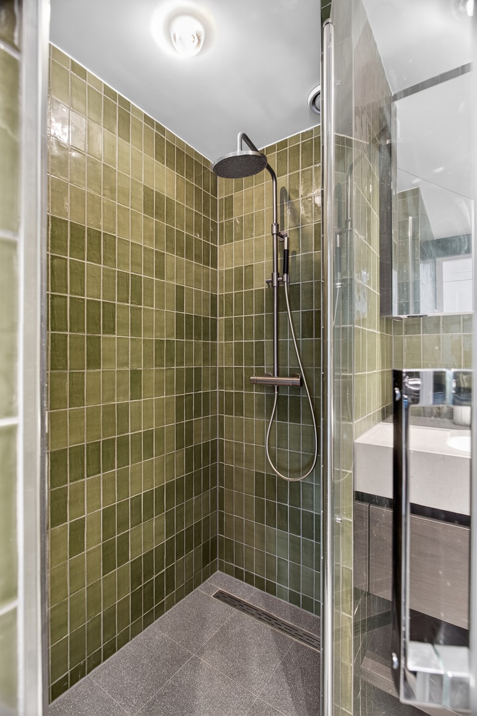The bathroom is finished with refined materials and distinctive dark green tiles, creating a timeless,