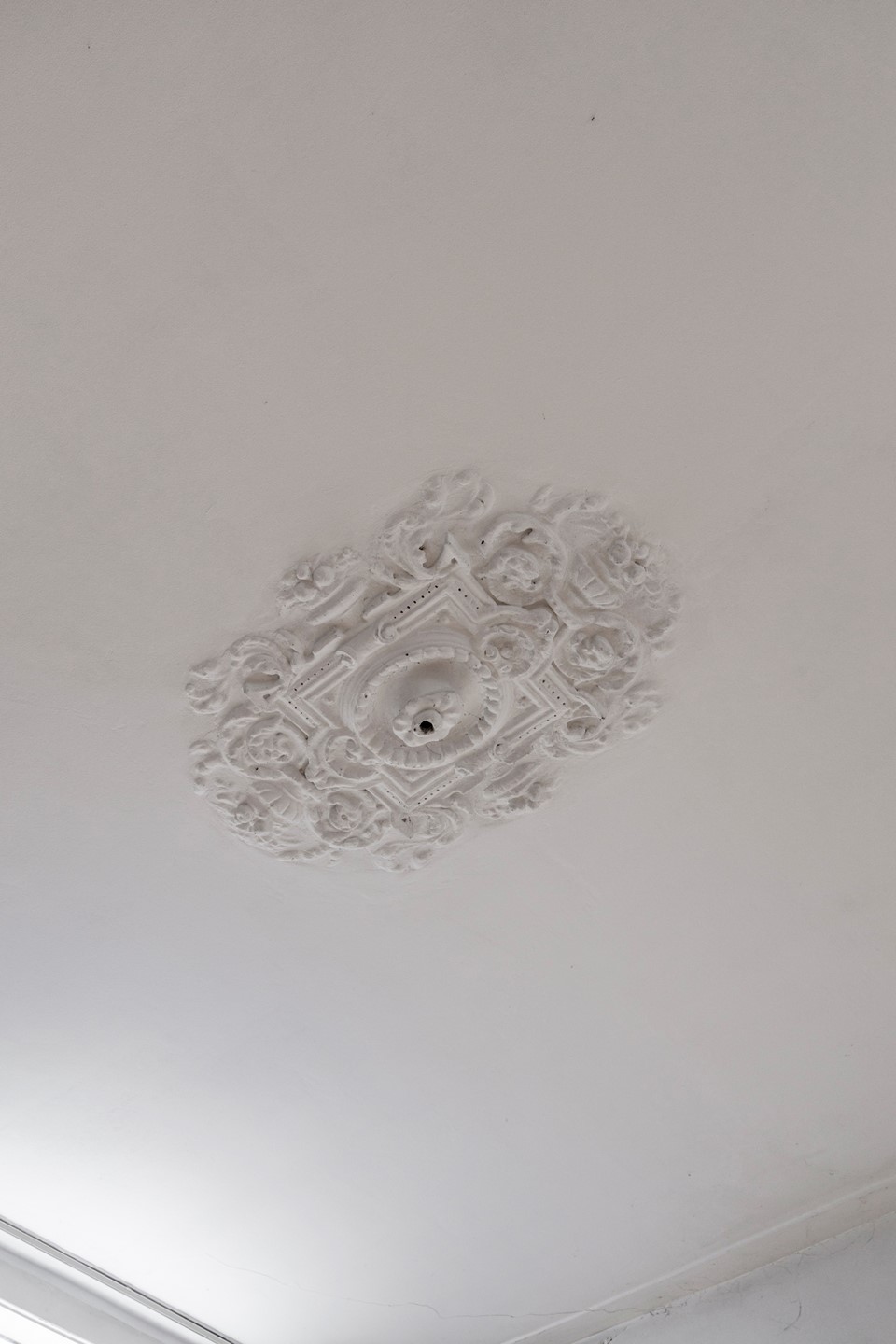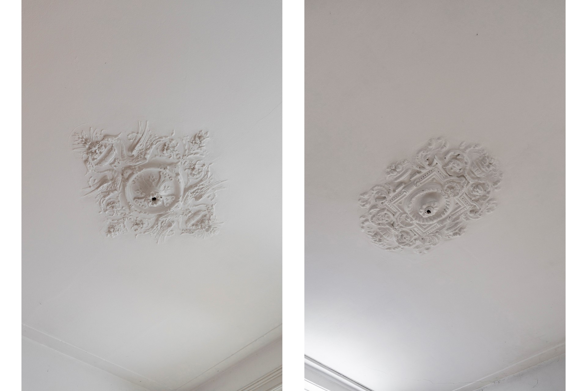 Ground floor: Entrance hall, meter cupboard, and storage cupboard. Spacious through-living room with high ceilings, built-in cupboard, and French doors leading to the rear garden with a brick storage shed. Simple kitchen and separate toilet. The kitchen also provides access to the south-facing garden and a small storage space stores the central heating boiler.