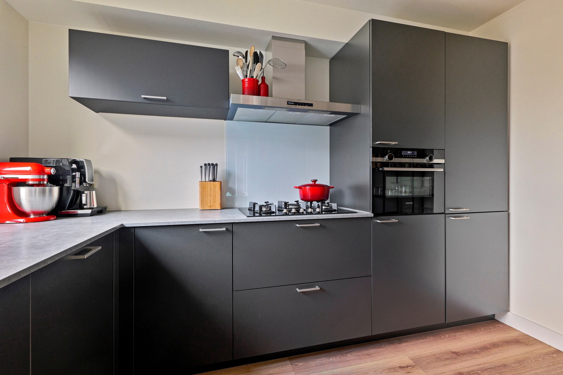 The modern kitchen is arranged in a practical corner layout and is equipped with various built-in appliances, including a 5-burner gas hob, extractor hood, dishwasher, refrigerator, freezer, and combination microwave oven. A washing machine connection is also available. From the kitchen, there is direct access to the balcony.
