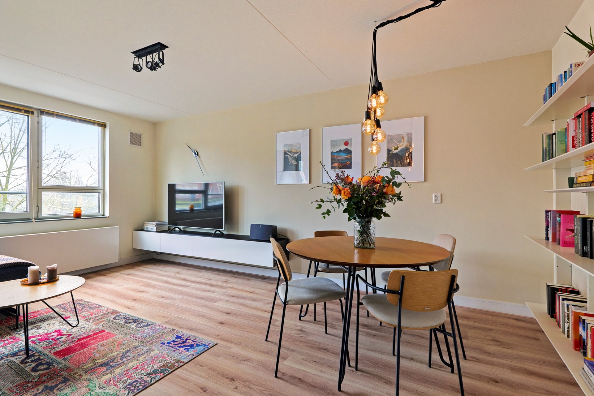 The entrance to the apartment opens into a hallway that provides access to all rooms. Upon entering the living room, the pleasant natural light and spacious feel immediately stand out. Thanks to the almost wall-wide window, the living room is wonderfully bright and offers beautiful views over Oosterpark. The room is neatly finished with laminate flooring, smooth plastered walls, and calm color tones, creating a modern and neutral base.