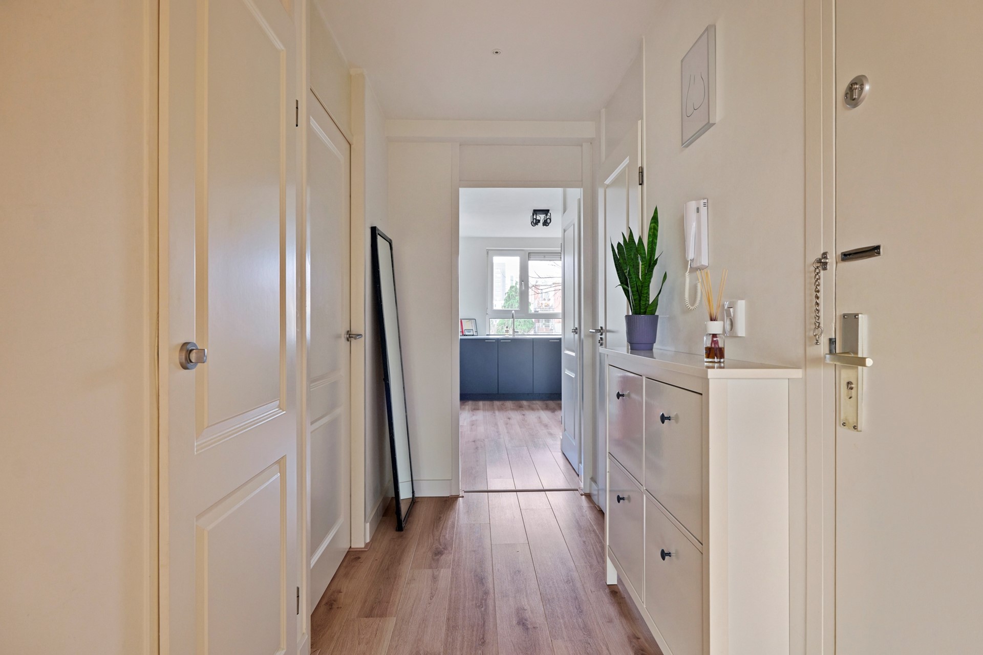 Entree van het appartement via de hal, die toegang geeft tot alle vertrekken. Bij binnenkomst in de woonkamer valt direct de prettige lichtinval en ruimtelijke uitstraling op. Dankzij het bijna kamerbrede raam is de woonkamer heerlijk licht en biedt deze een fraai uitzicht over het Oosterpark. De ruimte is netjes afgewerkt met een mooie laminaatvloer, strak stucwerk en rustige kleuren, waardoor het geheel een neutrale en moderne basis vormt.