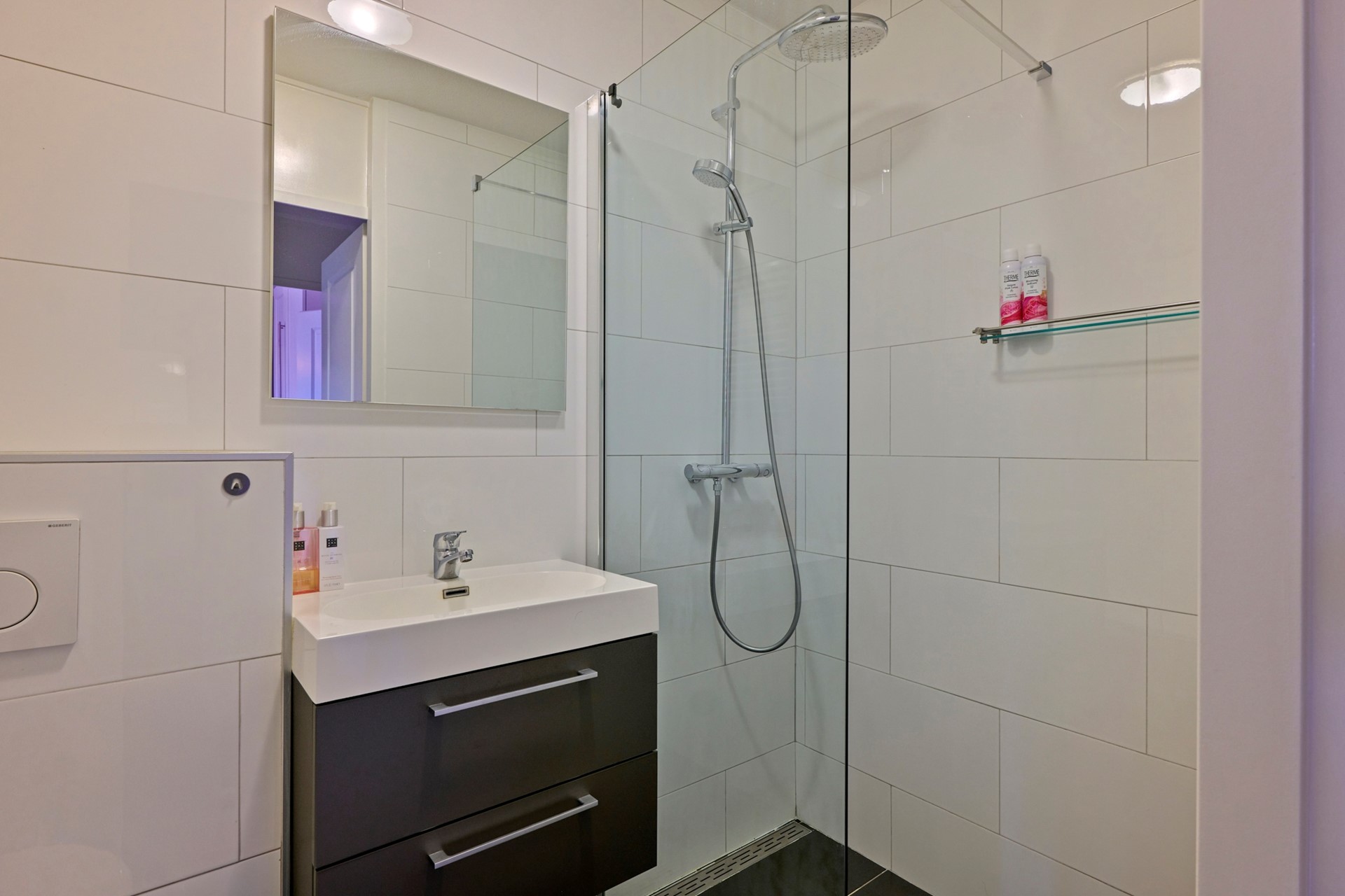 De badkamer is netjes afgewerkt en voorzien van een douche, wastafel en toilet.