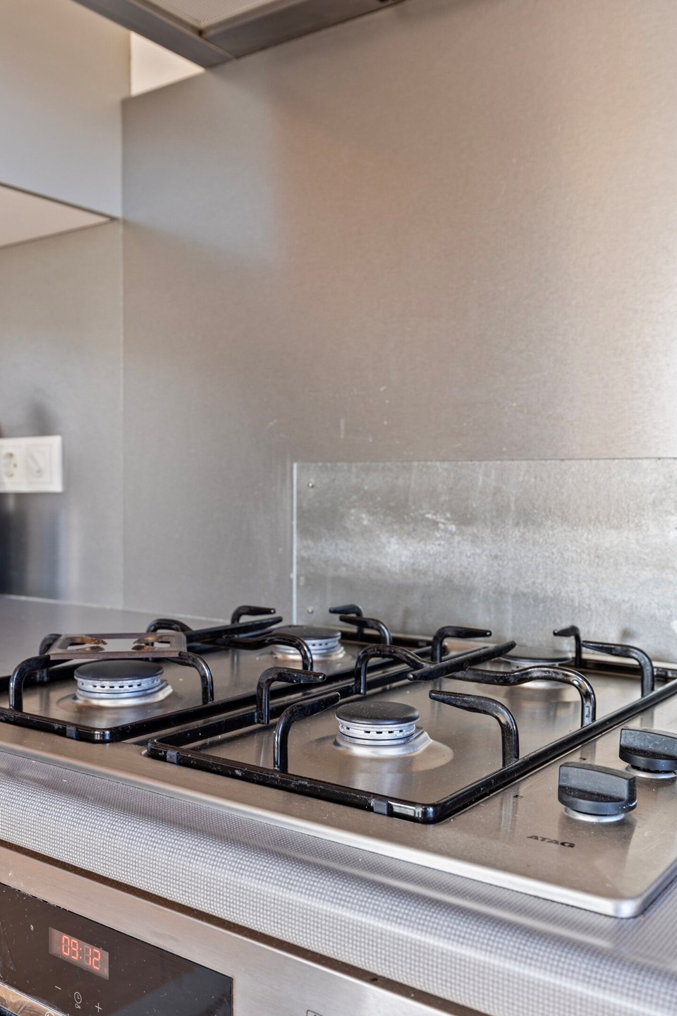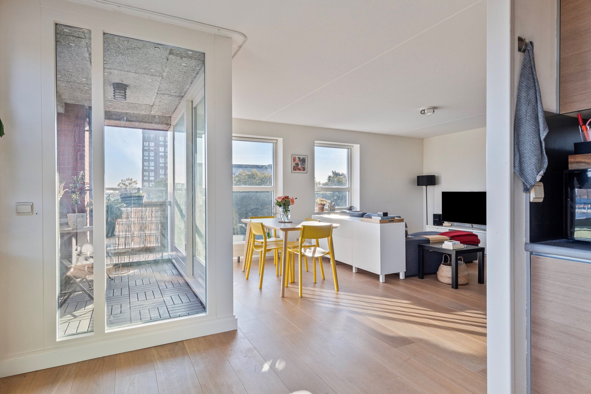 Entree met hal die toegang biedt tot alle vertrekken. De ruime en lichte woon- en eetkamer valt direct op door de vele ramen en de schuifpui naar het eerste balkon op het noordoosten, waar je heerlijk van de ochtendzon geniet. De moderne open keuken is uitgerust met diverse inbouwapparatuur, waaronder een 4-pits gaskookplaat, RVS-afzuigkap, elektrische oven, vaatwasser en koelkast.