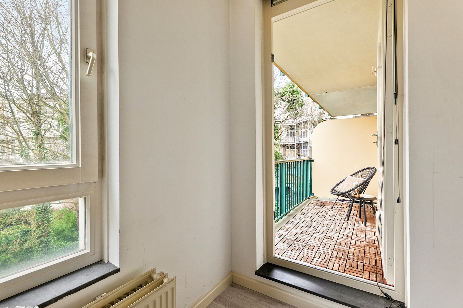 Vanuit beide slaapkamers heb je toegang tot het rustig gelegen balkon op het Westen, waar je heerlijk kunt genieten van de middag- en avondzon.