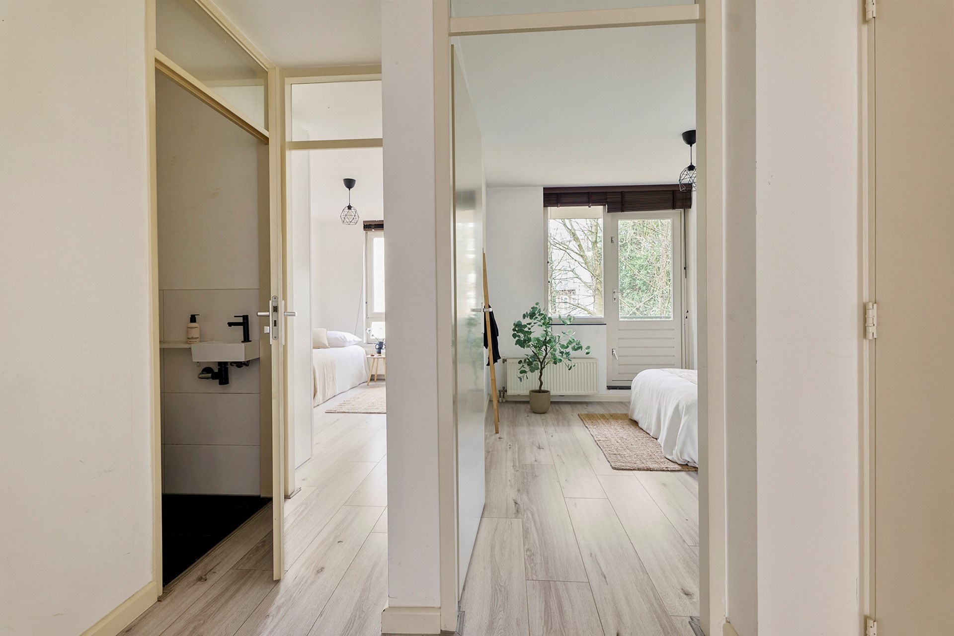 Dit appartement kenmerkt zich door een prettige lichtinval en een efficiënte indeling. De woning is voorzien van een laminaatvloer en strak gestuukte wanden, wat zorgt voor een moderne en verzorgde uitstraling.