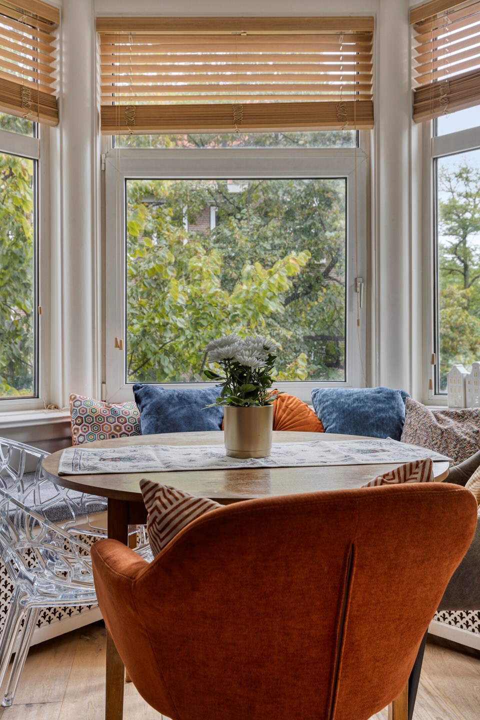 At the front, the bright living room features a sunny bay window with a beautiful, open view over the Kostverlorenvaart.