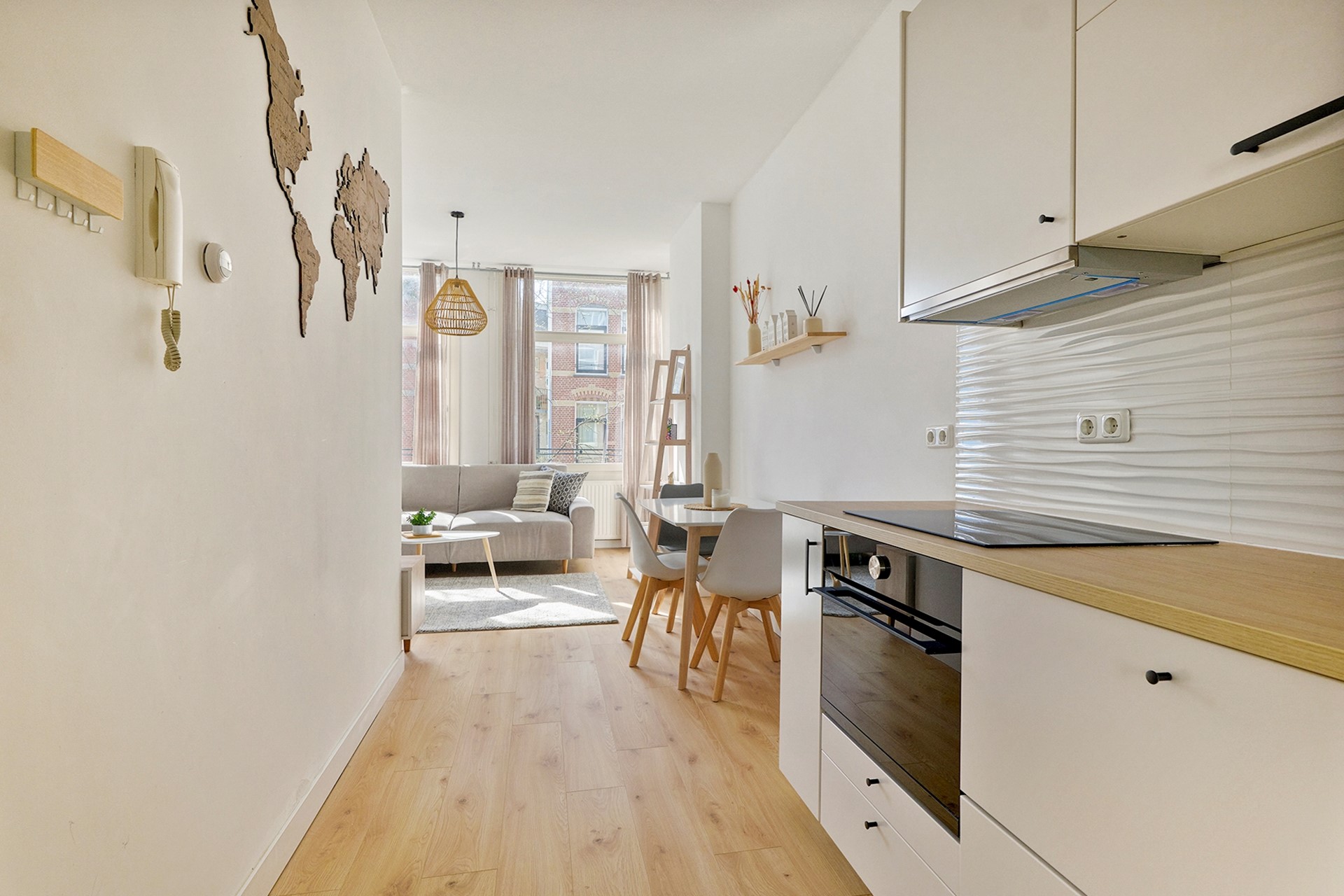 Aan de voorzijde van de woning ligt de lichte woonkamer met een plafondhoogte van circa 2,85 meter, wat zorgt voor een ruimtelijk en aangenaam gevoel. Aangrenzend bevindt zich de eetkamer met de moderne open keuken. De keuken is in 2024 vernieuwd en voorzien van diverse inbouwapparatuur.