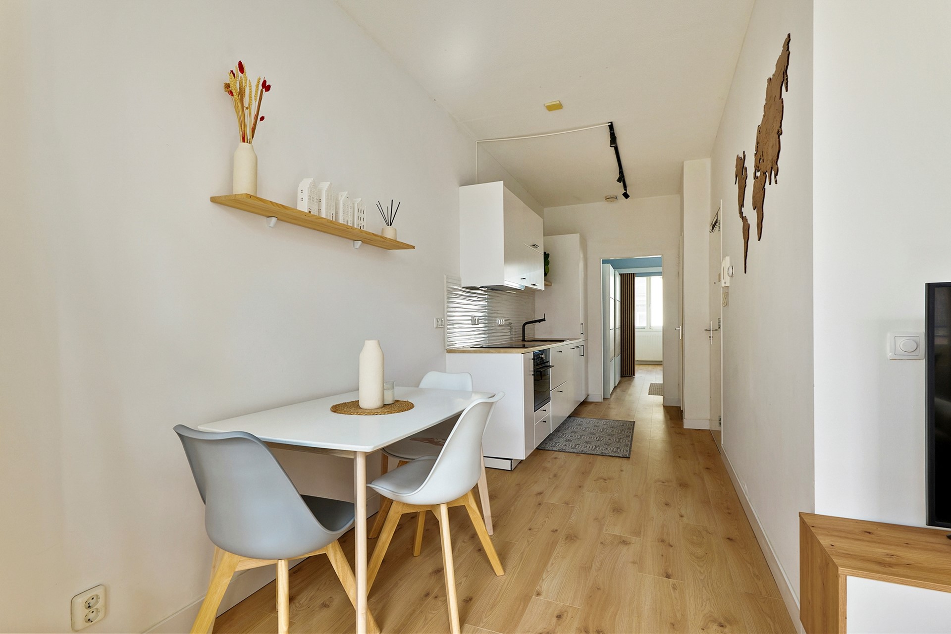 De woning is recent gemoderniseerd: alle wanden zijn strak gestuukt en geschilderd en de vloer is vernieuwd. Daarnaast zijn bestaande kasten verwijderd, waardoor extra ruimte is gecreëerd voor een praktische kantooropstelling en een aparte wasruimte.